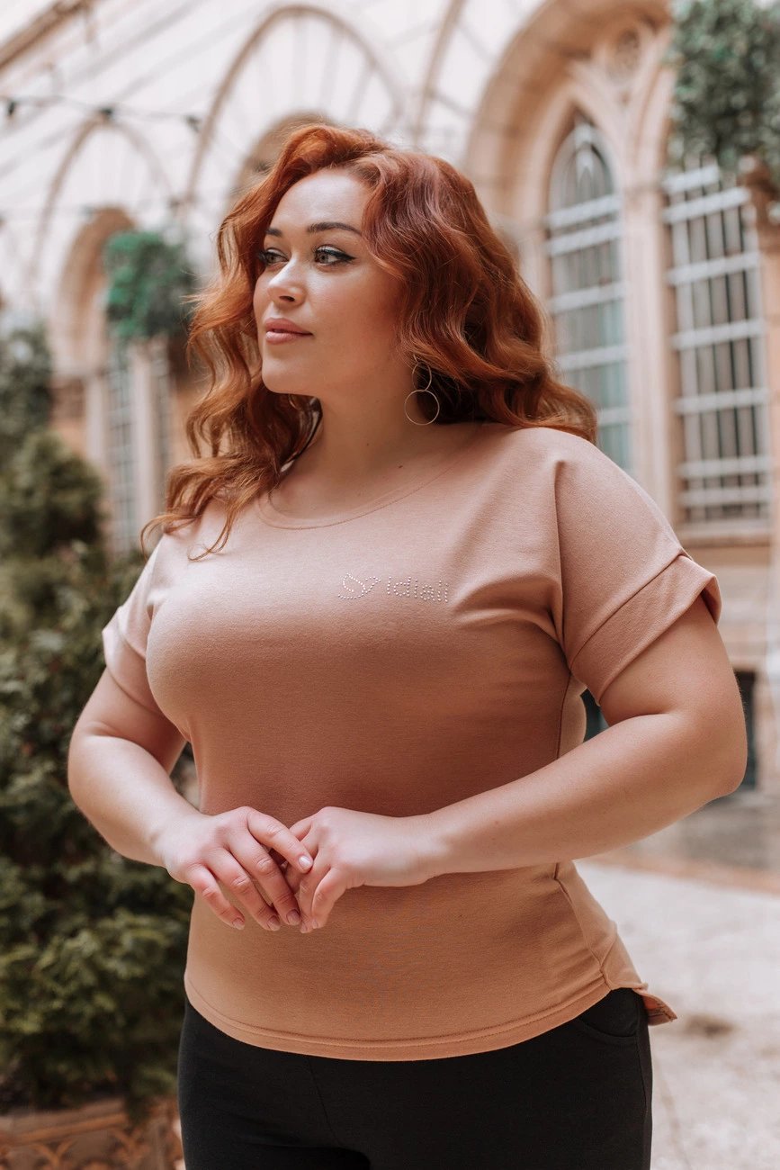 Жіноча футболка зі стразами пудра р.54
